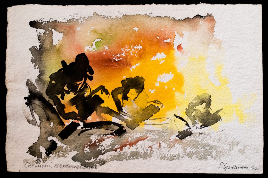 Kvällen var svart och idisslandet från insekterna hade börjat. Det doftade av väsande fotogenlampor och tända eldar, som anses ha kraft att hela sjukdom. [24] På den lilla altanen var en matta av torkat gräs utrullad åt kvinnan, medtagen av sjukdomen. En levande och bunden gris hade burits fram nedanför. Detta var ett offer i ceremonin för kvinnan berättade Un. Insekterna tystnade då de tre shamanerna kom uttågande till altanen från huset, som på en scen. Nu var de dekorerade i pannband med fjäderskrud, gröna blad[25] om överarmar och knän samt medaljonger hängande om halsarna. [26] Enligt Un ska dekorationerna efterlikna fåglar och andra djur för att behaga andarna. Männen satte sig att recitera lågmält och klangrent på ömsom olika oktaver. Därefter inledde tre yngre män taktfasta slag på handgjorda trummor och glasflaskor. Shamanerna ställdes sig upp och med svängande rörelser började gå runt i cirkel och sjunga med höga röster, medan fötterna stampade så att det brakade och gungade i altanens träplankor. Dansandet pågick runt, runt medan trummorna och männens höga röster ekade mot den täta skogen. Slutligen stelnade den äldre av shamanerna till och började röra sig som i trans. Mannen yttrade ord med knappt hörbar röst medan han vaggades fram och tillbaka mellan övriga shamaner. Un sa senare att detta var en av vanliga ceremonier då shamanerna åkallade krafter i andevärlden för att blidka deras makt att i detta fall göra kvinnan frisk. Efter ceremonin lades medicinmannen försiktigt på altanplankorna för att vila ut efter den ansträngande ritualen.