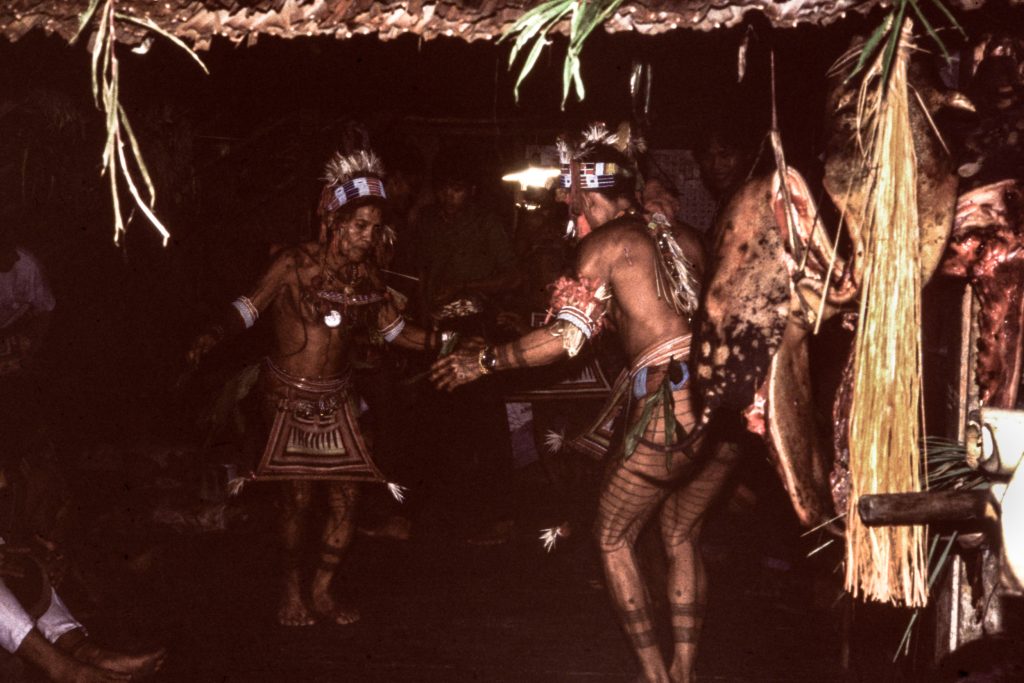 Under tiden hade husets kvinnor avlivat och slaktat grisen, lagt köttet i bambustavar och rostat dem över den öppna elden. De fyllda bambustavarna bars ut på altanen där shamaner och andra deltagare, inklusive oss besökare, bjöds att dela offret tillsammans med bakade bröd av sagopalmens innanmäte. En del av köttet var rått men jag åt ändå något för att bidra till helandeprocessen, men orolig för eventuella infektioner. Inga påhälsningar skedde dock, varken under kvällen eller dagarna därpå.