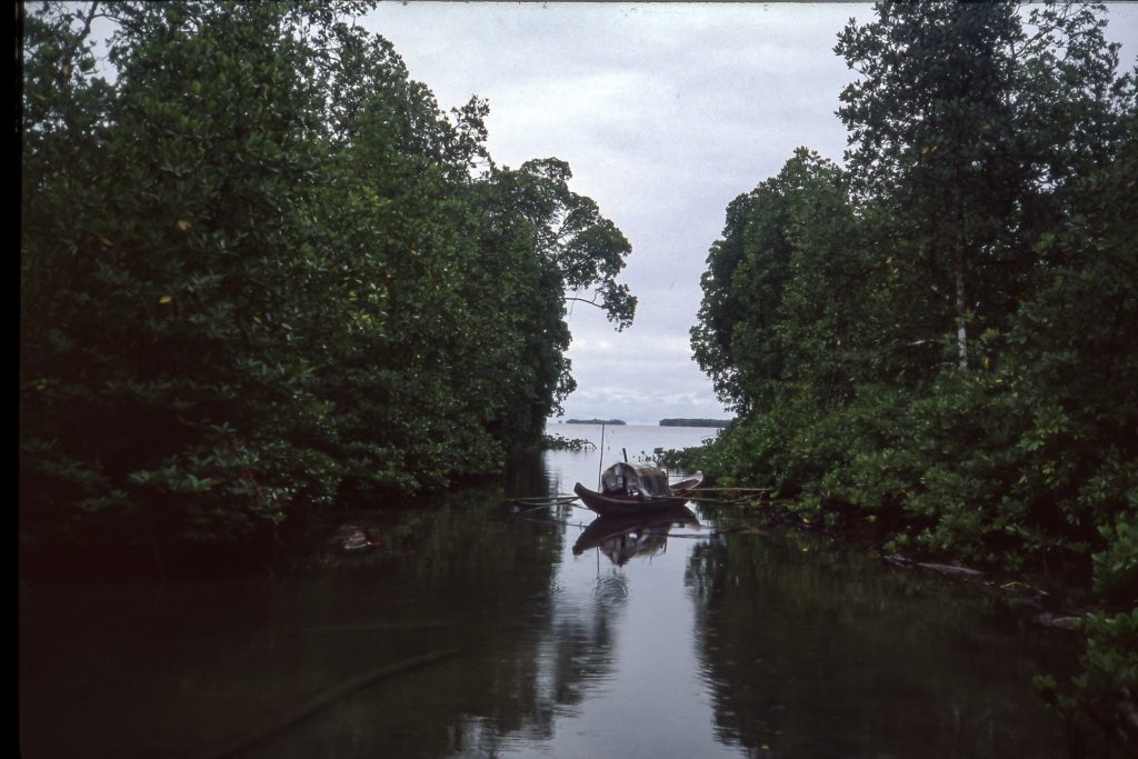 En dag tog vi oss på stigar längs ett vattendrag till kusten och mangrovebuskagen. Tidvattnet hade sköljt över dess rotsystem så att vi kunde färdas med en närliggande kanot bland de slanka vridande stammarna med spretande luftrötter och täta lövverk. Mangroveskogen var enligt Un en av detta Umas’ fiskeplatser och barnkammare för småfisk, som kunde gömma sig i virrvarret samtidigt som de åt upp sig. Nästan ljudlöst flöt vi genom grönskan och det kristallklara vattnet och såg en mångfald av olikfärgade fiskar. Minnet gick till den ovannämnda myten som i människors tankevärld handlade om de första människorna i övärlden. Var det denna sorts skog som kvinnan då skulle ha mött när flotten träffade på land? En mer eller mindre ogenomtränglig värld av gyttja och grönska. Det är ju en myt, men berättelsen tyckte jag pekade på människors idé om sin värld i närheten till havet och träsken. Mangroven borde på så sett vara både utmark från träskmarkerna och skydd för inkräktare. I så fall var Mangroven nödvändig för människornas idé om sitt liv och sin upplevelsevärld. Un hade satt några nät och fick tillräckligt med fångst för kvällens middag.