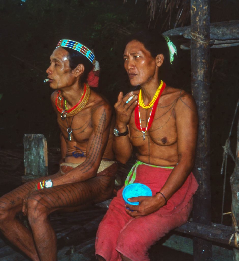 När det blev mörkt kom ett par från ett Uma i närheten på besök. Bägge var dekorerade med kroppstatueringar. Tatuering är för övrigt en tradition på öarna. [17] Enligt Un blev tatueringarna fler med åldern och betydelse inom Uma. Vidare hade mannen ett pannband och halsband i olika färger. Både mannens och kvinnans handleder pryddes av klockor, som för mig verkade mer dekoration än någonting att hålla tiden med. Bägge sög på cherootliknande cigaretter, vilket jag fann vanligt bland mentaweiborna. Tobaken förvarades i en plastburk ur vilken man rullade sina cheroots. Bägge var barbröstade. Mannen hade höftbeklädnad av barken från brödfruktträdet, vilket jag senare skulle förstå. Kvinnan bar ett bomullstyg om höfterna som gick ner över knäna. De kom tillsammans med ytterligare en man, Aman Baran, som vi skulle återse ett par gånger till.