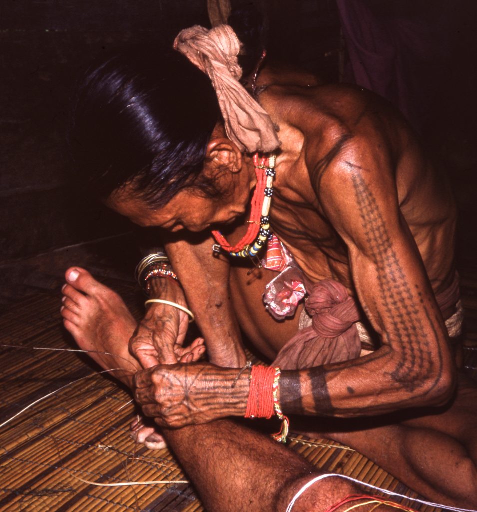 Utanför hyddan igen träffade vi en man i trettioårsåldern i färd med förberedelserna inför jakten. Han log ett tandlöst leende i ett färgglatt höftskynke med hibiskusblomma i håret och cheroot i mungipan. Han spände bågen mot himlen, blinkade till oss och sköt iväg pilen [19]. Det var så man bedrev jakt på djur som fåglar, apor och annat berättade Un. Jakten bedrevs med förgiftade pilar.